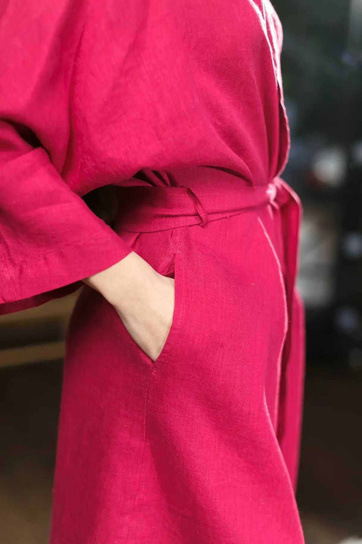 Bathrobe in a soft linen, with pockets in the side seams and a tie belt at waist.